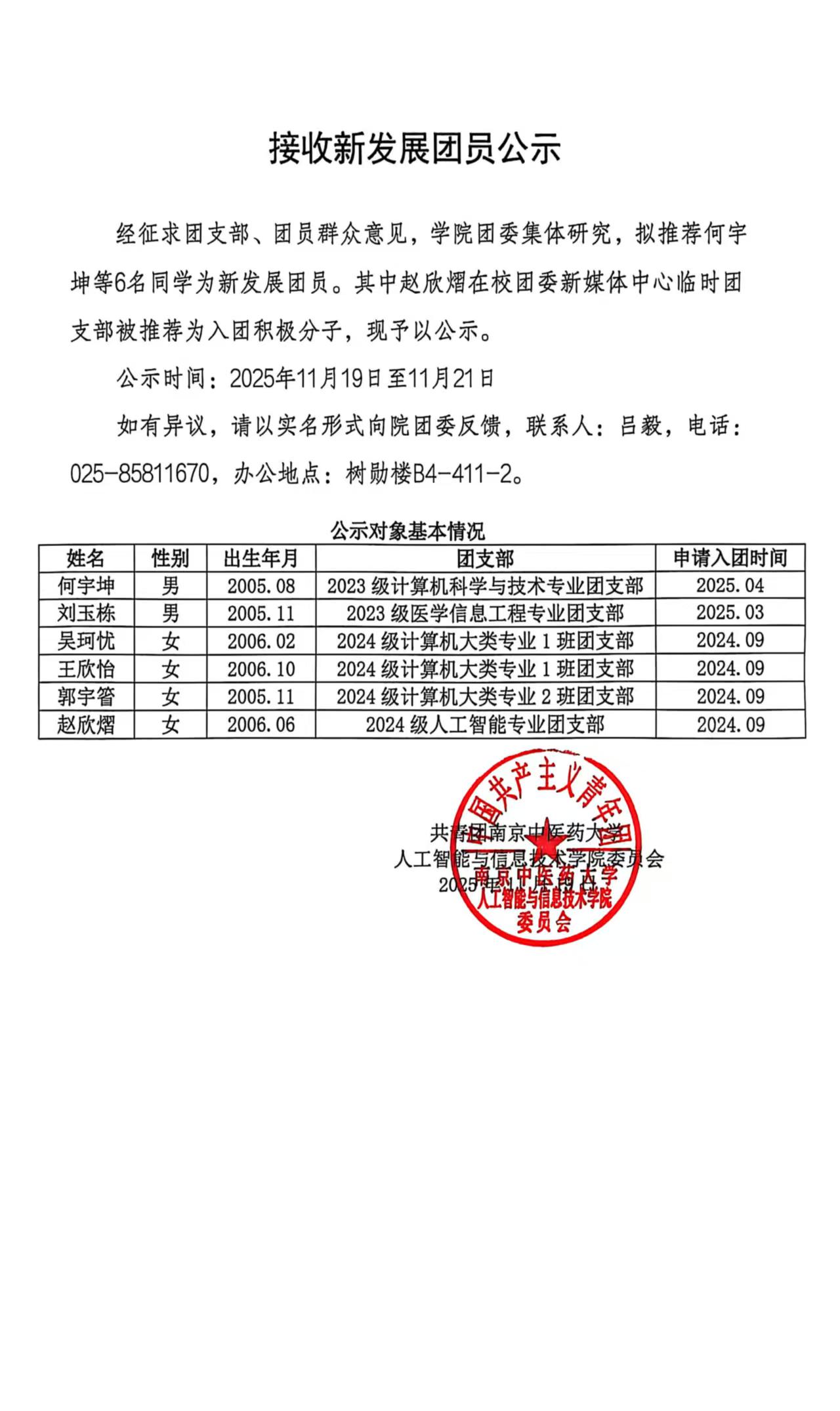 2025年下半年接收新发展团员公示